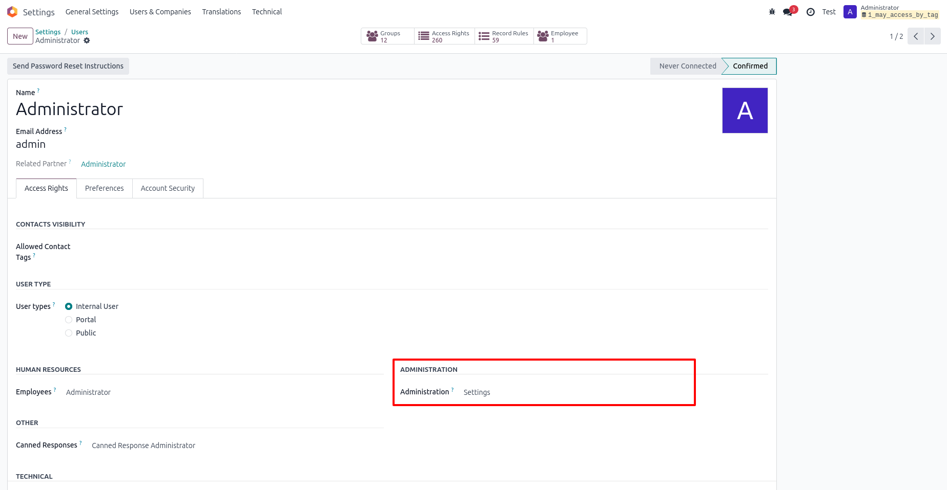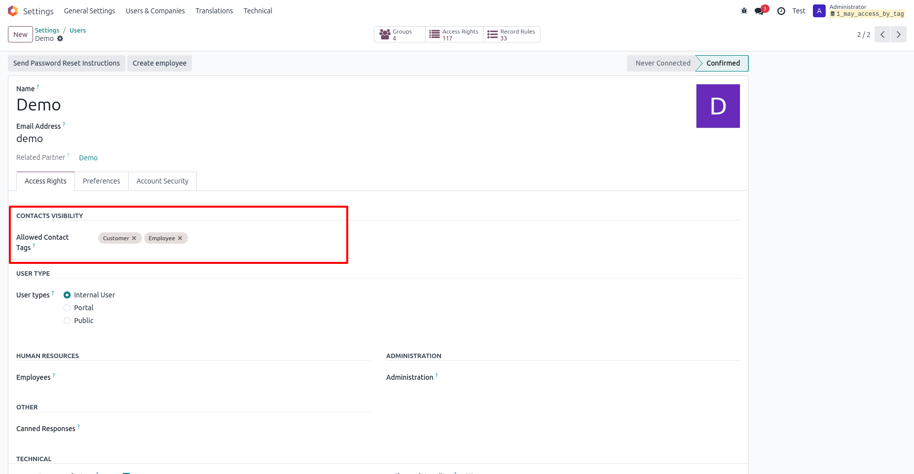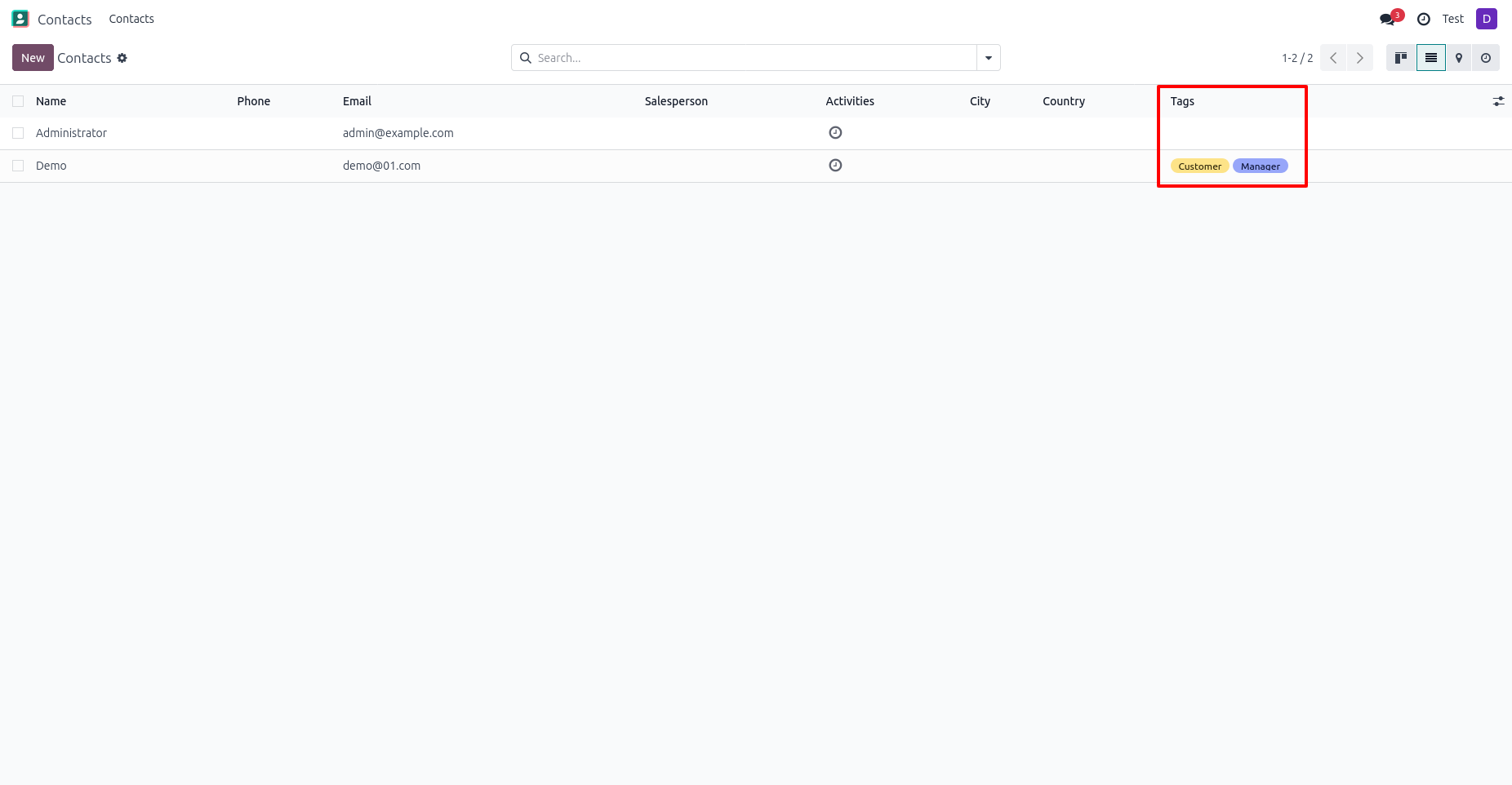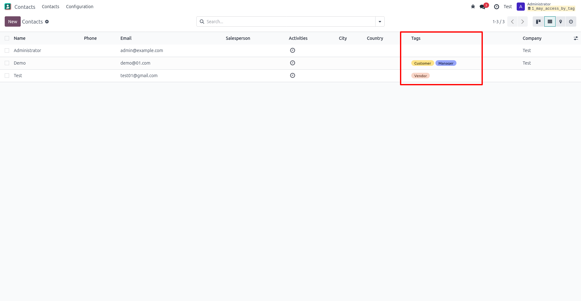 Allow users to access contacts based on assigned tags.Each user will only be able to see contacts that either match the tags they are authorized to view or have no tags assigned at all, And user with administration access rights can access all the contacts, No need to assign any tags to user with administration access rights.