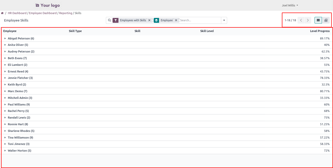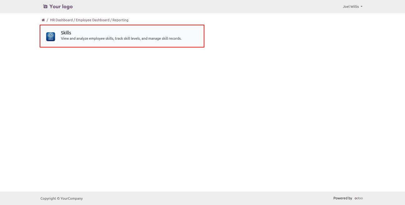 Click on Reporting -> Skills to open a backend-like view, where users can view and manage all employee skills record records