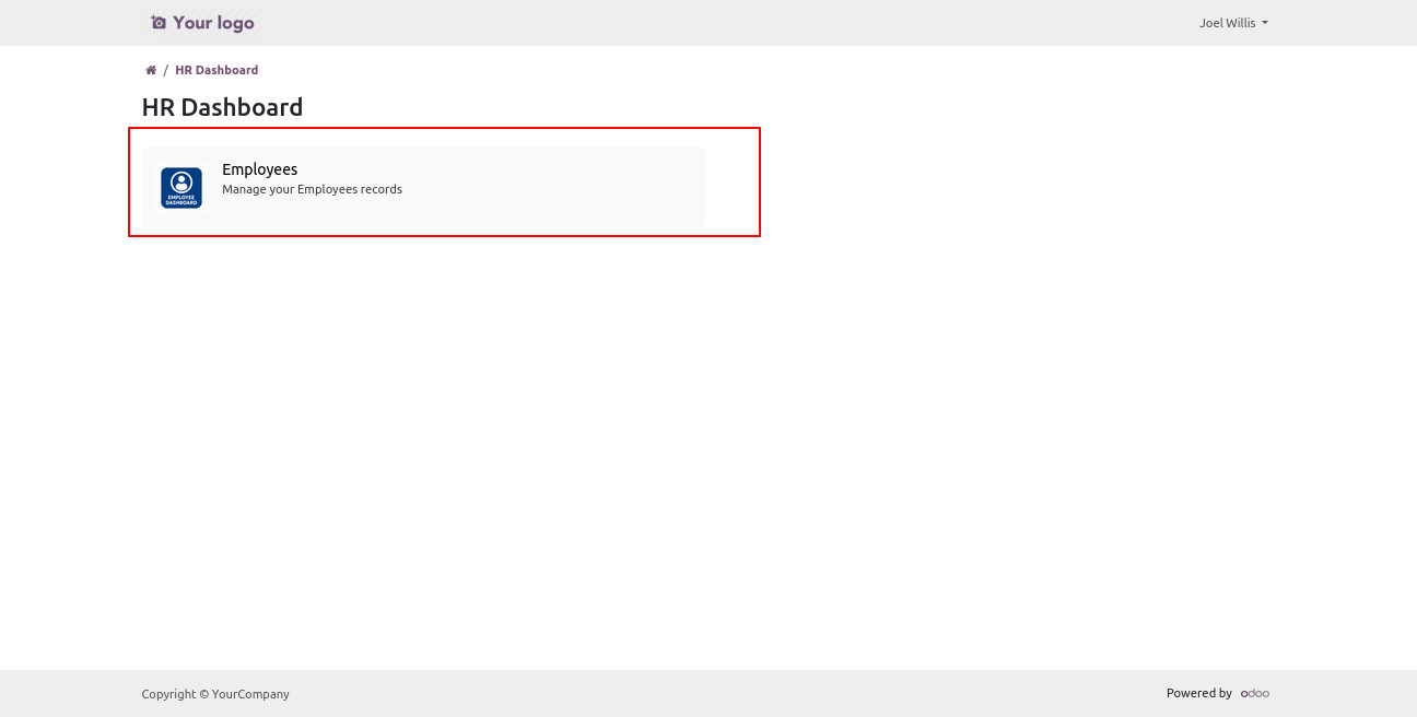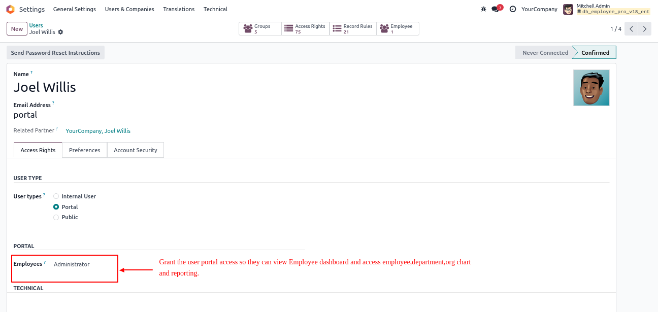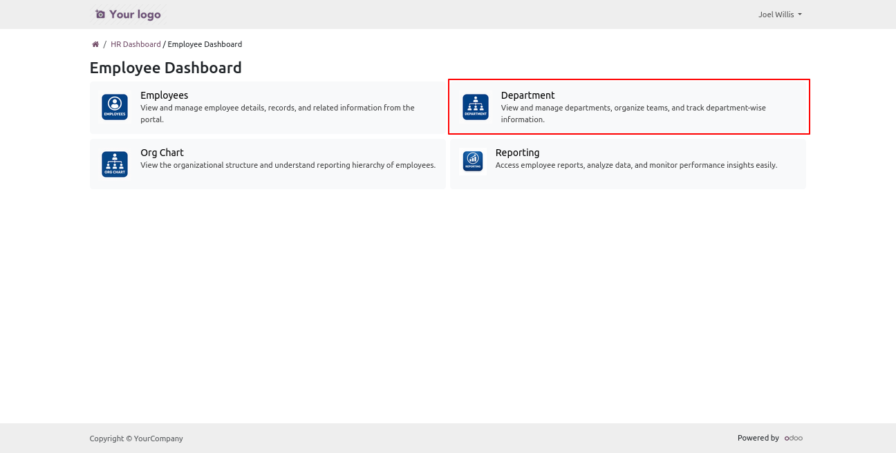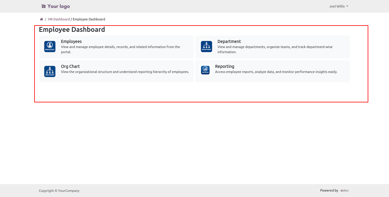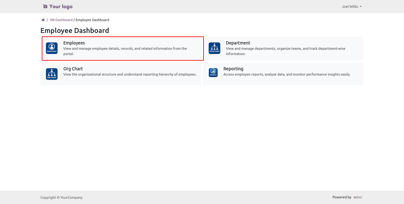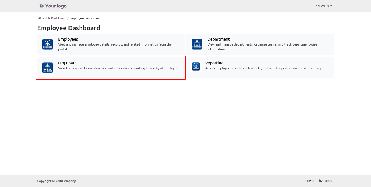 Install the module, then create an employee record linked to the portal user. Grant the user access to the EMployee Portal, along with permissions to view Employee, Department, Org Chart and Reporting.