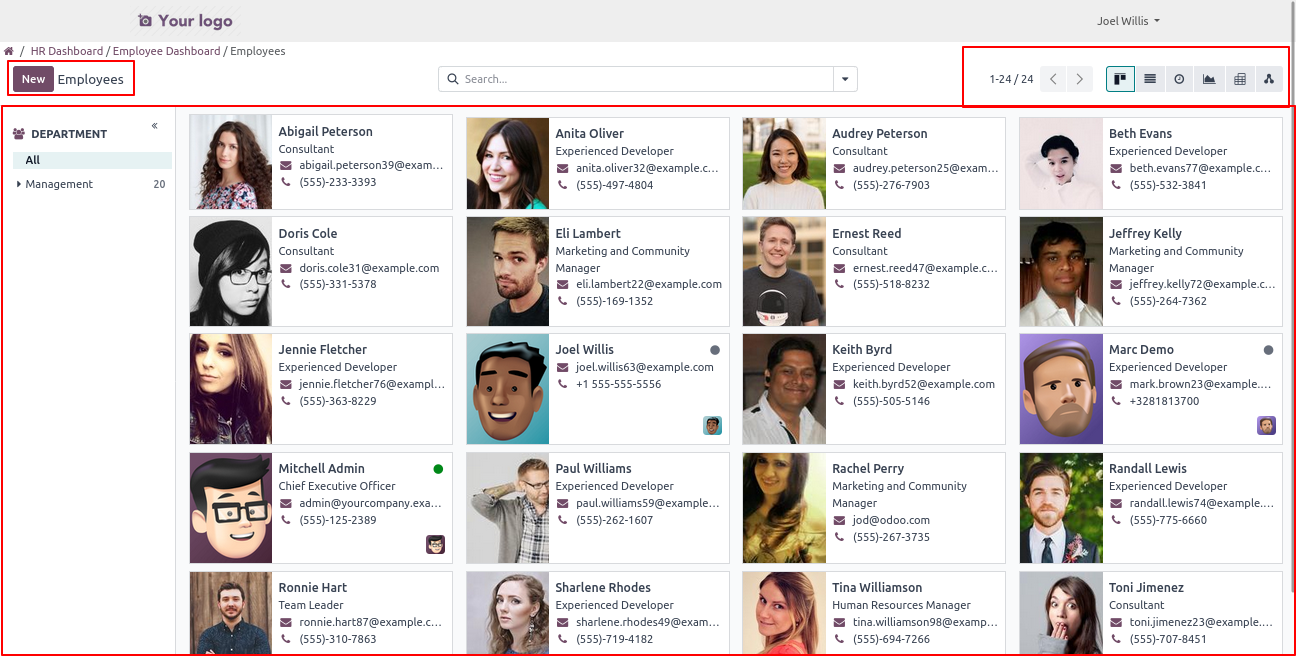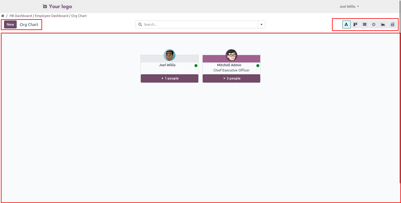 Click on the Org Chart menu to open a backend-like view, where users can view org chart and create,Write new employee records based on their access rights.