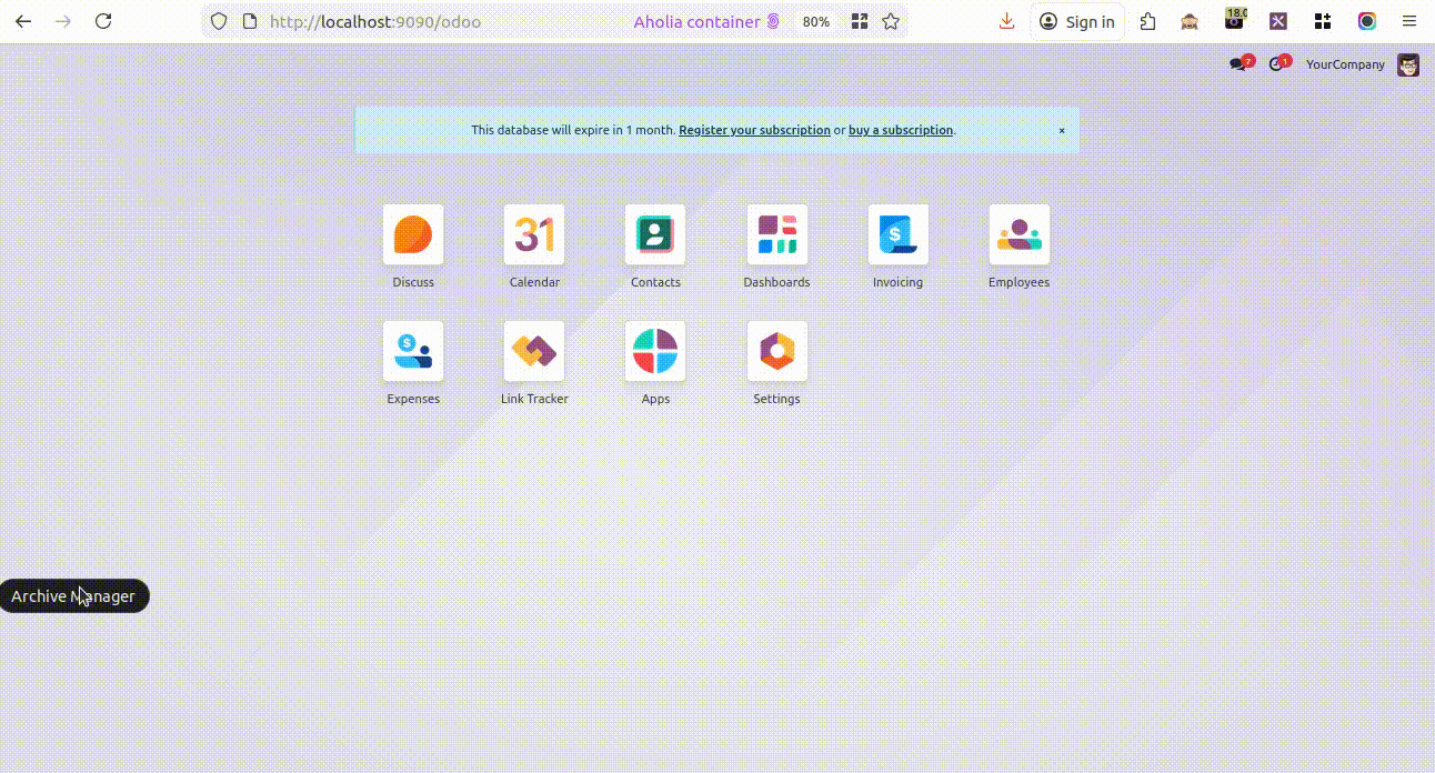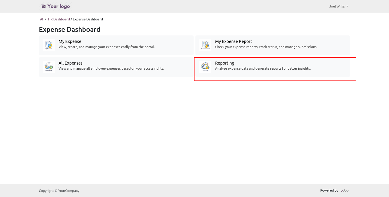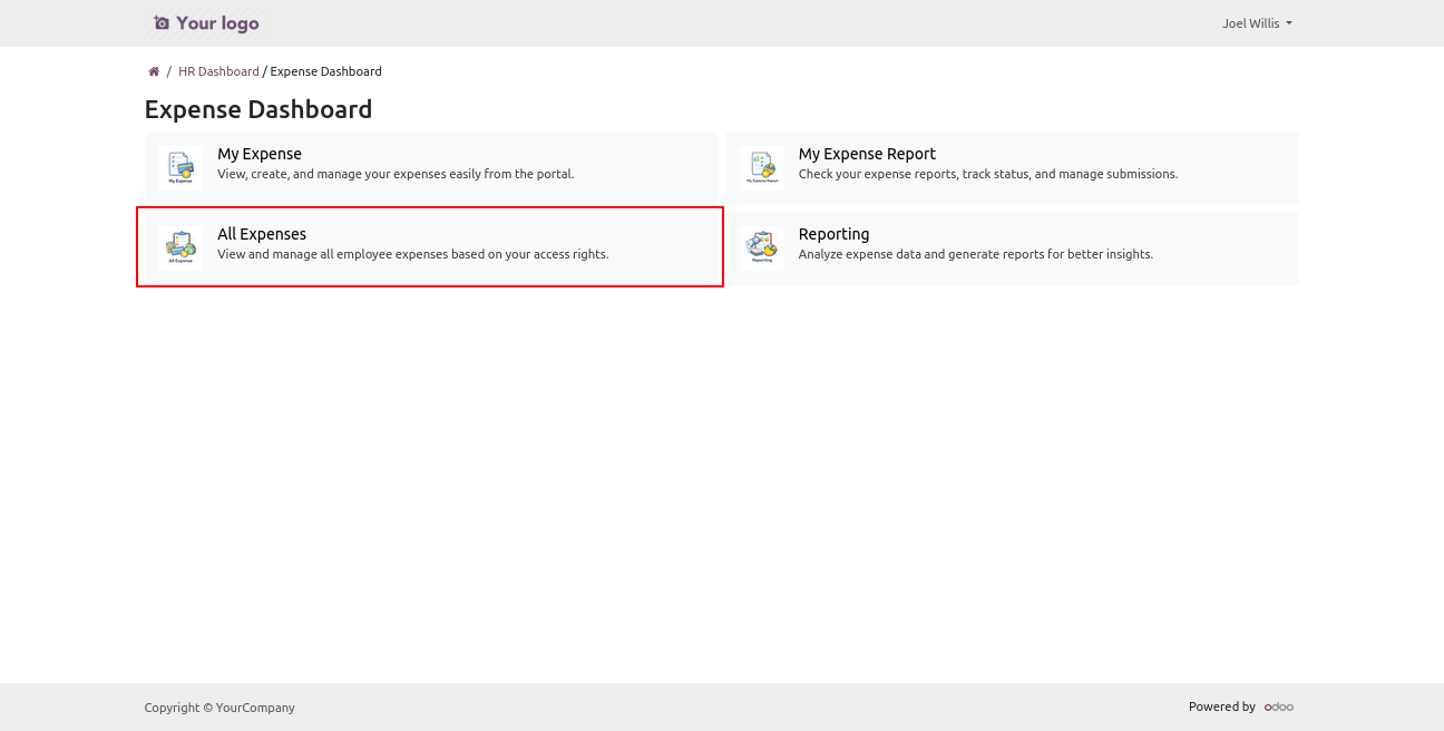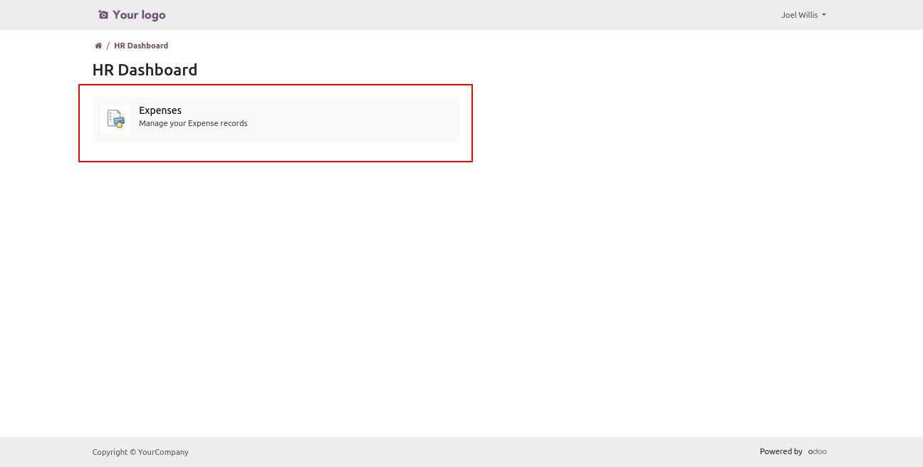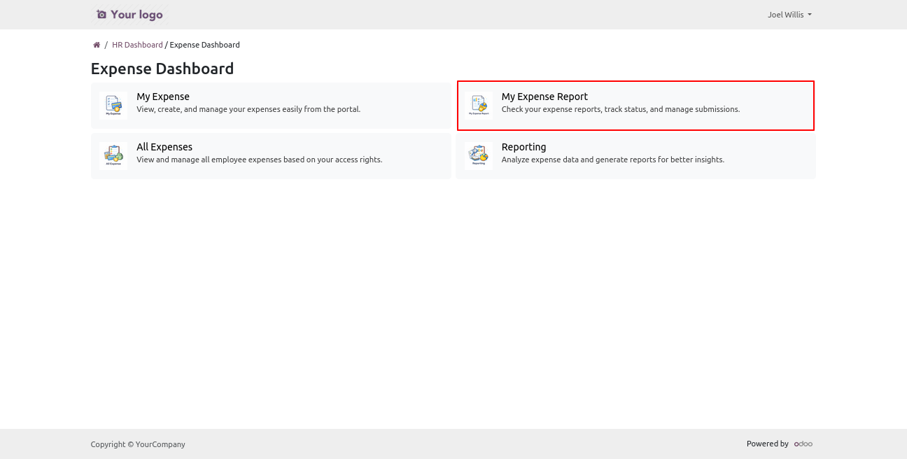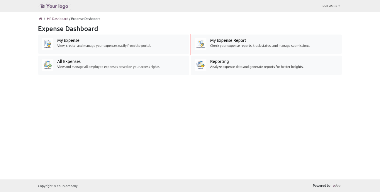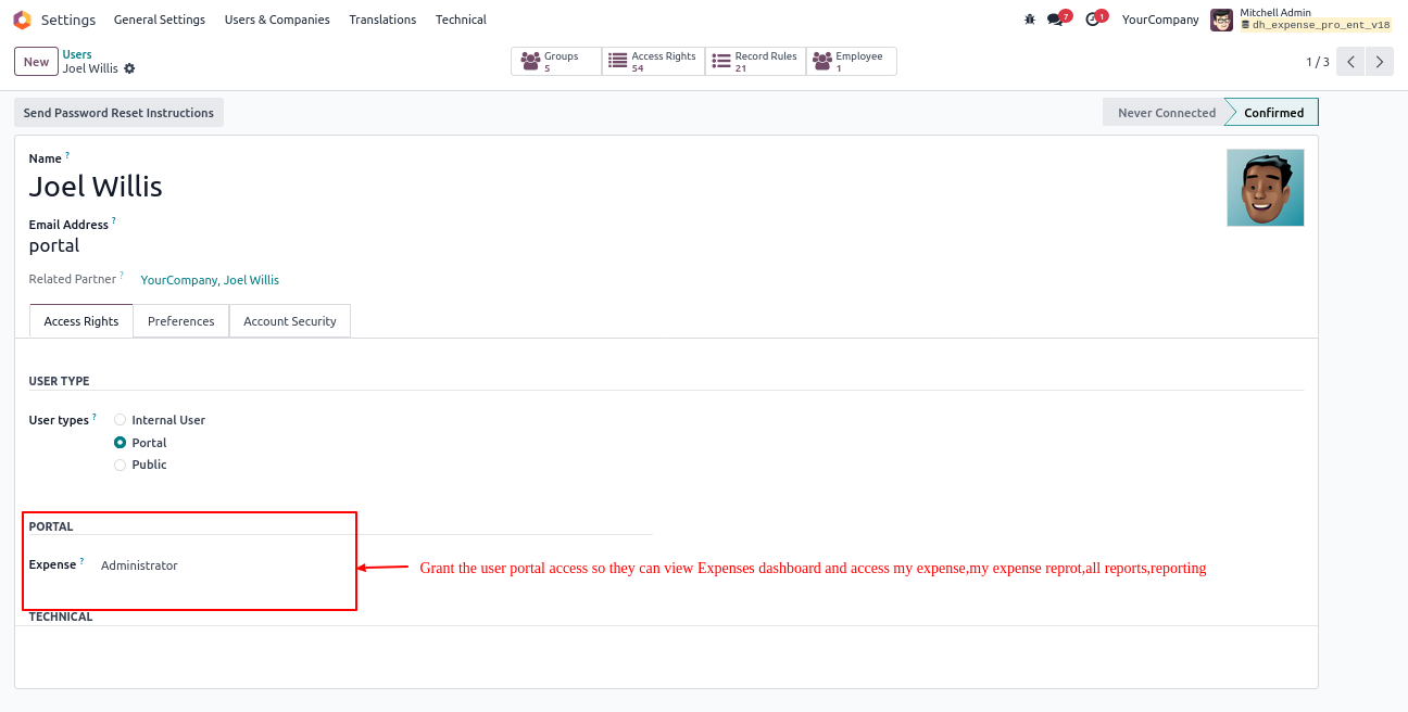 Install the module, then create an employee record linked to the portal user. Grant the user access to the Expense Portal.