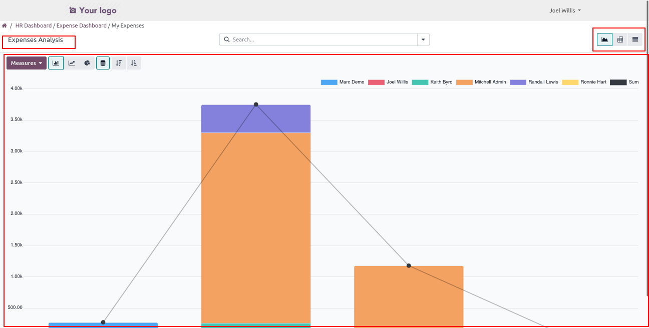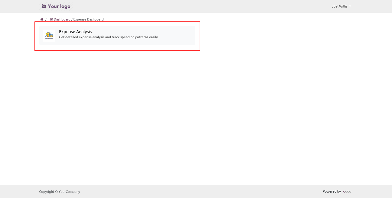 Click on Reporting -> Expense Analysis to open a backend-like view, where users can view and manage all employee expense analysis records