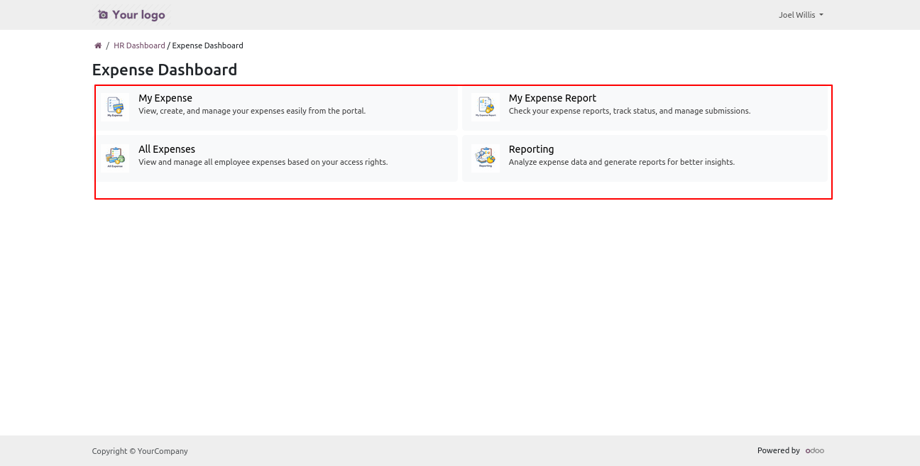 A user-friendly Expense portal in Odoo that allows portal users to access and manage expense records directly from the portal without needing any backend or internal user access. Users can create expenses, submit reports, track status, and manage expense-related activities from a simple and secure interface. This module makes expense management easy, transparent, and accessible for external users while maintaining proper access control and security.