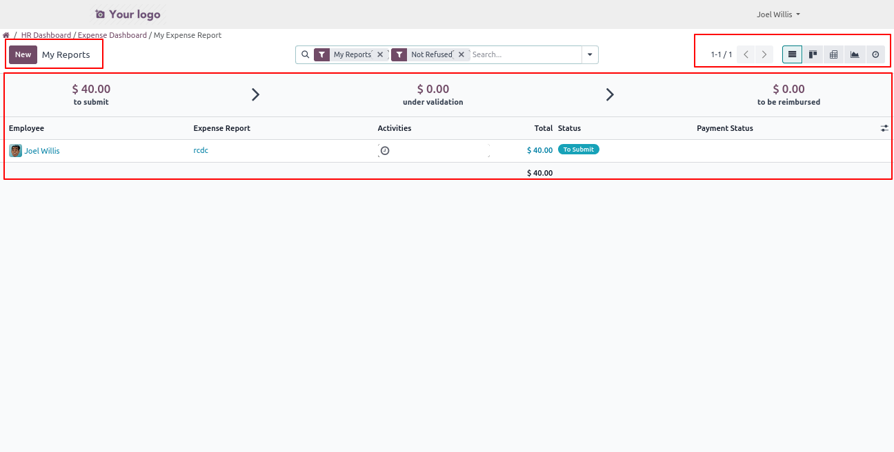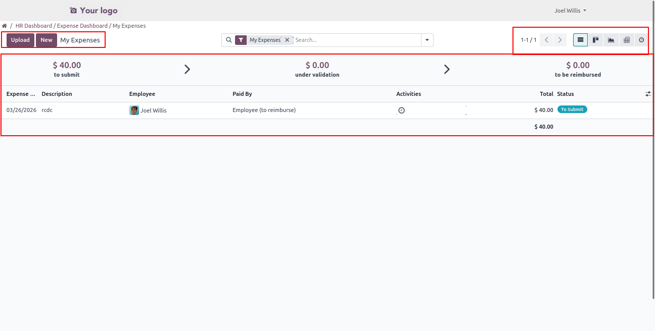 Click on the My Expense Report menu to open a backend-like view, where users can view their own expenses report and create new expense report records.