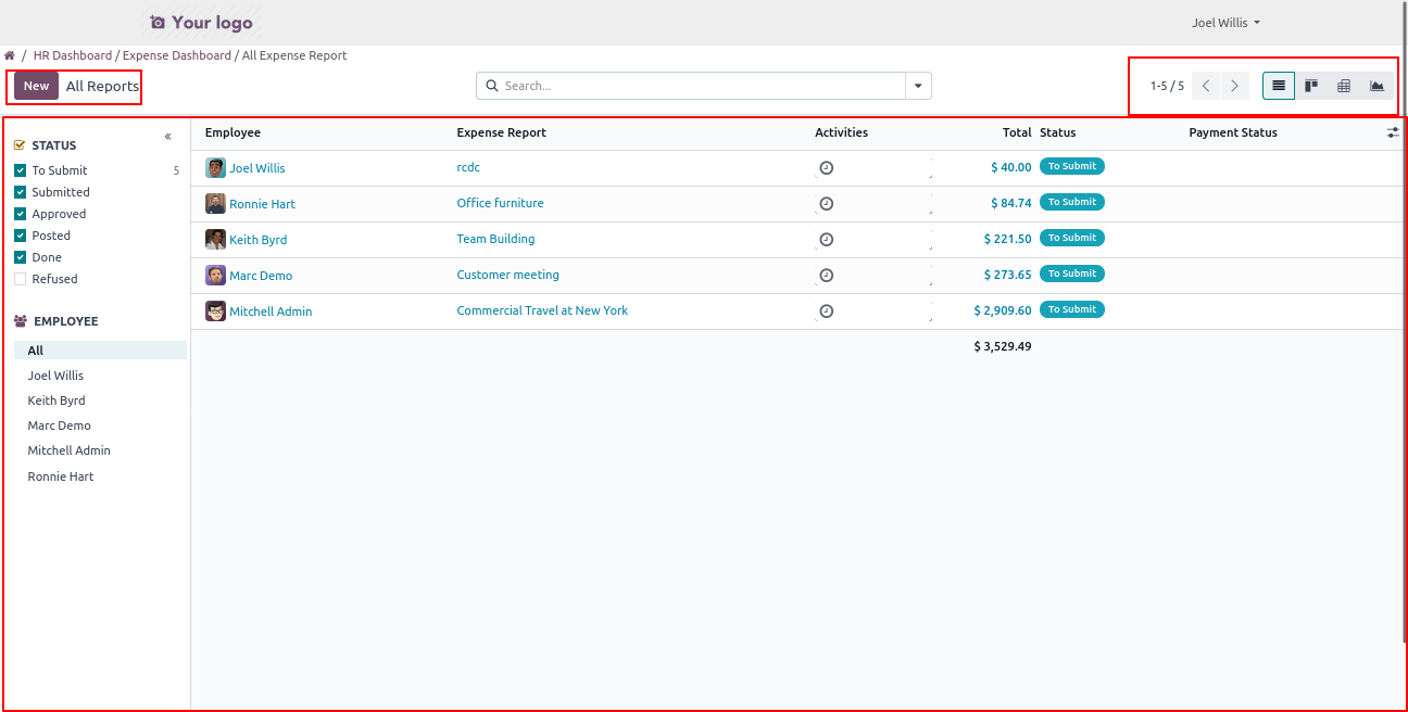 Click on the All Expenses menu to open a backend-like view, where users can create, view, and manage all employee expense records.