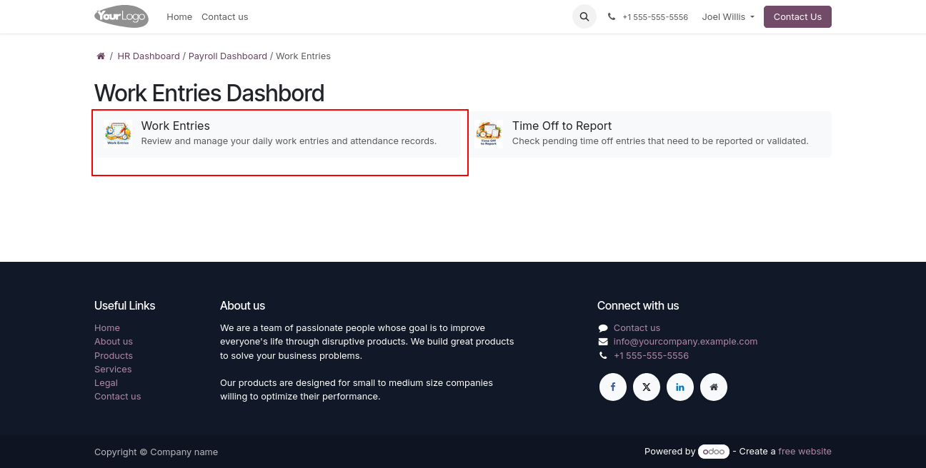 | Included Dependencies | Employee from Odoo Portal With Backend View Employee Portal User Link Portal: Frontend HR Dashboard |