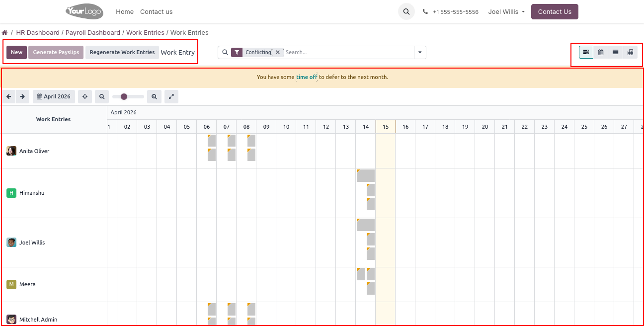 Click on Work Entries -> Work Entries menu to open a backend-like view, where users can view and manage all employee work entry records.