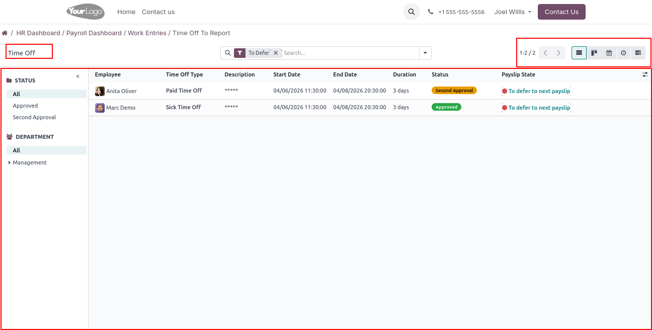 Click on Work Entries → Time Off to Report menu to open a backend-like view, where users can view and manage all employee time-off records.