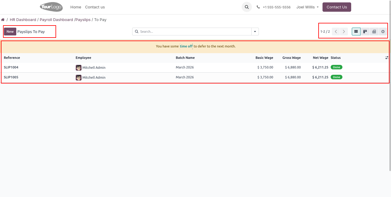 Click on Payslips - > To Pay menu to open a backend-like interface, where users can view pending payslips, check salary details, and track payment status for each record.