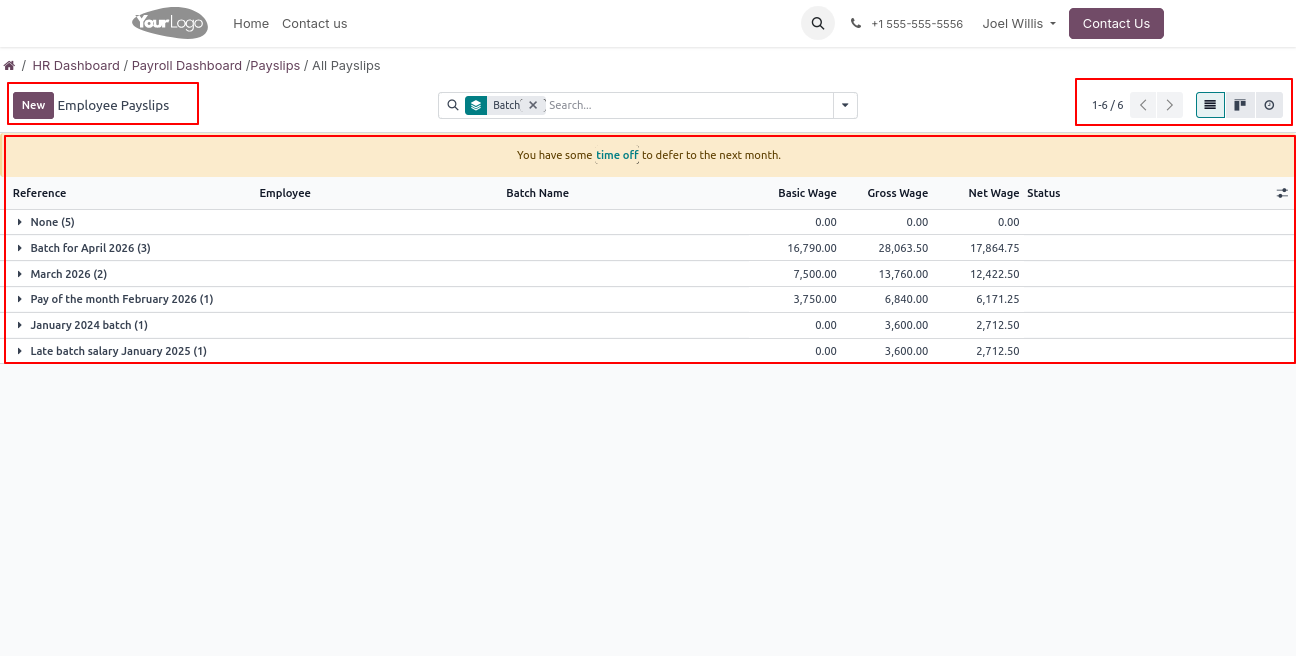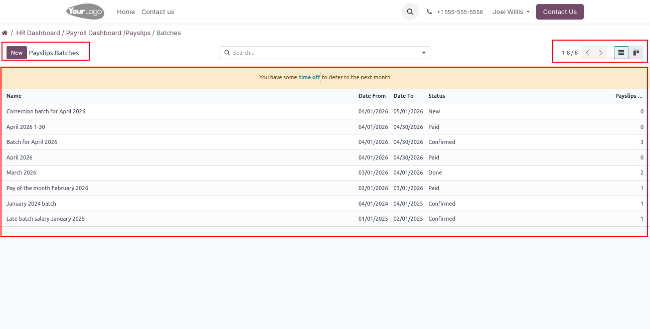 Click on Payslips - > All Payslips menu to open a backend-like interface, where users can view all payslip batches, check salary details, and analyze payroll records across different periods.