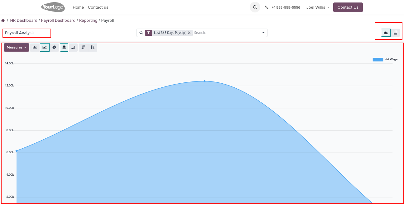 Click on Reporting - > Payroll menu to open a backend-like interface, where users can visualize payroll data, track salary trends, and analyze payslip records using charts and filters.