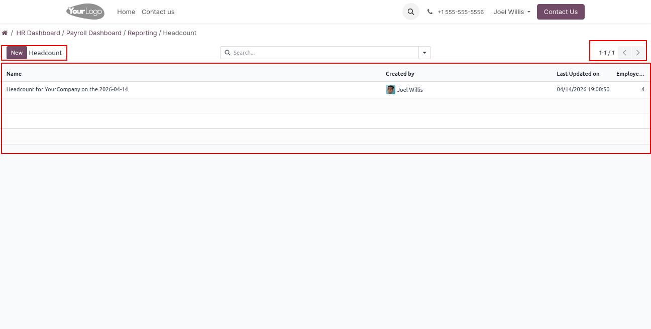 Click on Reporting - > Headcount menu to open a backend-like interface, where users can view and manage all employee headcount records.