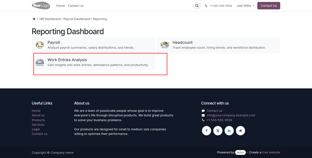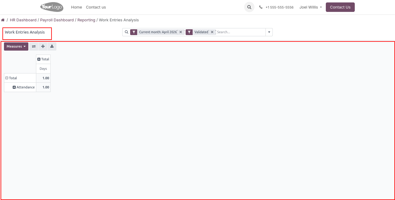 Click on Reporting - > Work Entries Analysis menu to open a backend-like interface, where users can view and analyze all employee work entry records.