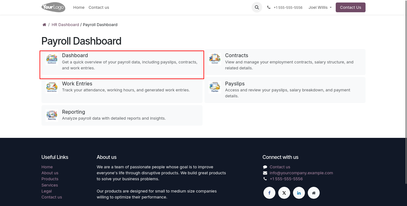 Log in as a portal user to access the Payroll menu, where all related submenus of the payroll dashboard are displayed.