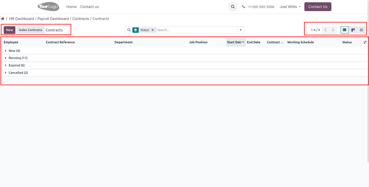 Click on Contract -> Contract menu to open a backend-like view, where users can view existing contracts and create new contract records.
