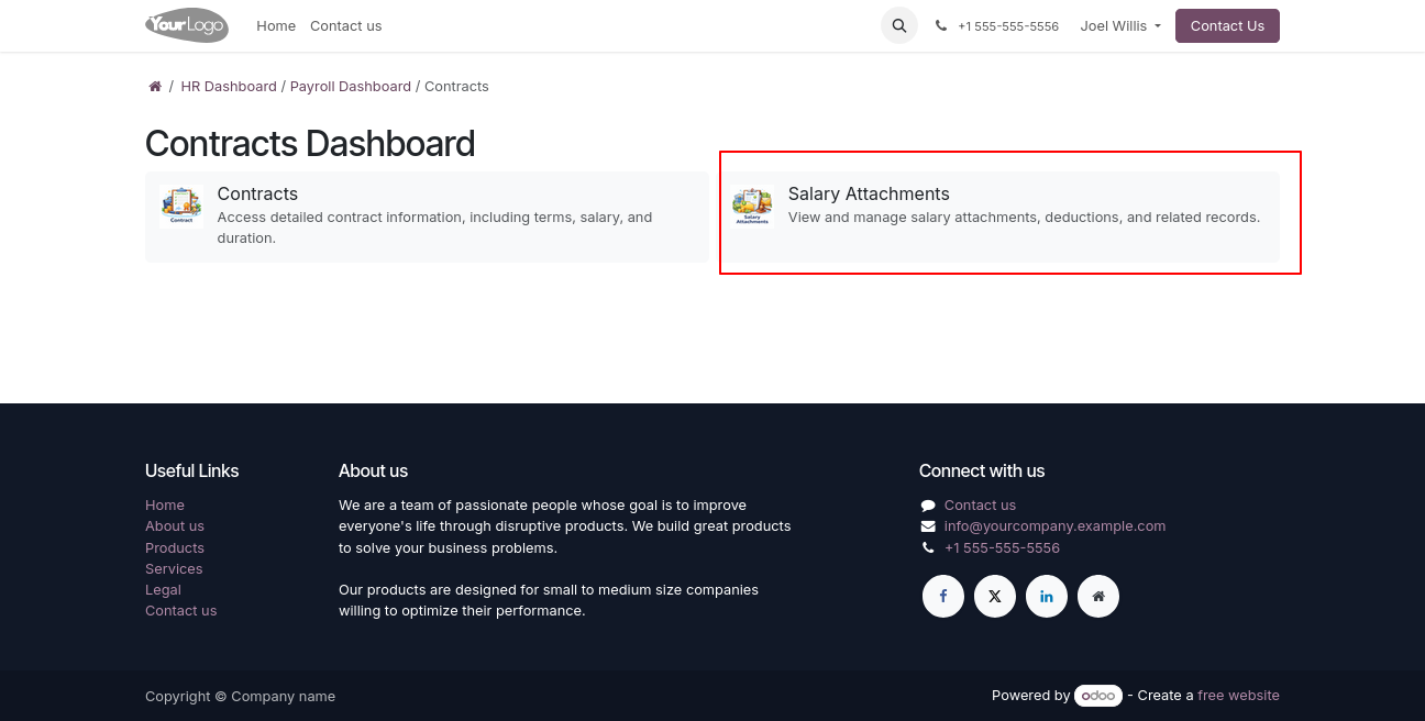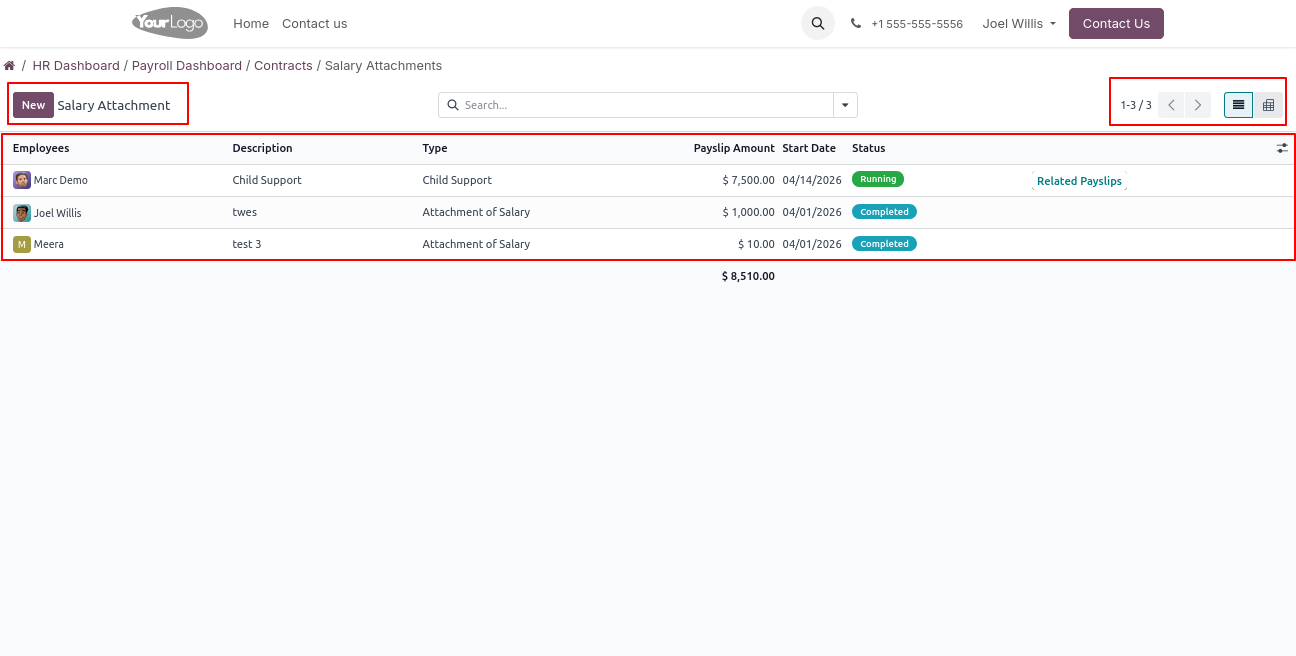 Click on Contract -> Salary Attachment menu to open a backend-like view, where users can create, view, and manage salary attachment records efficiently.