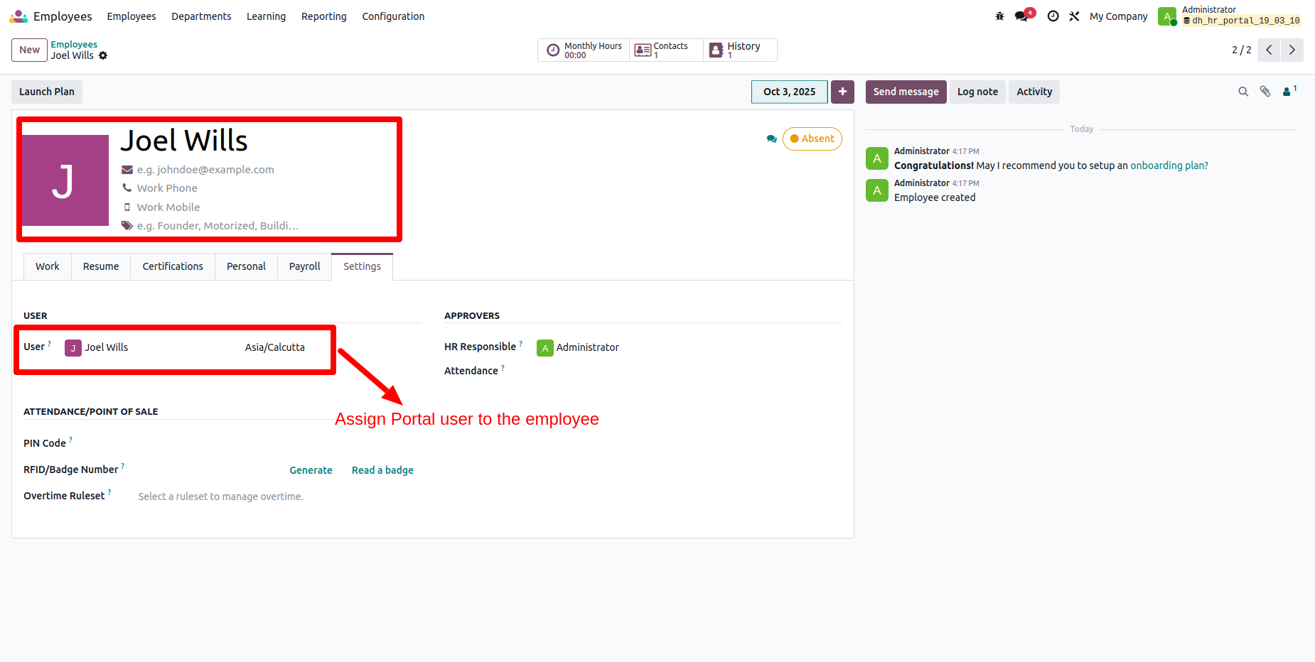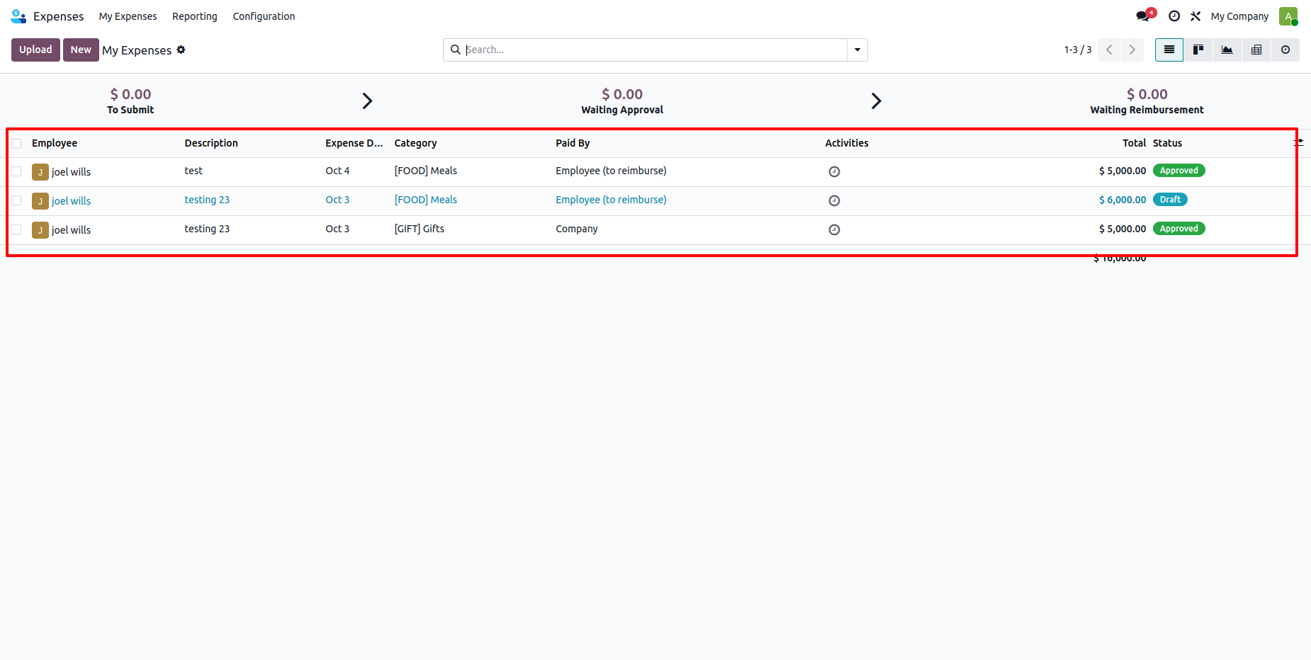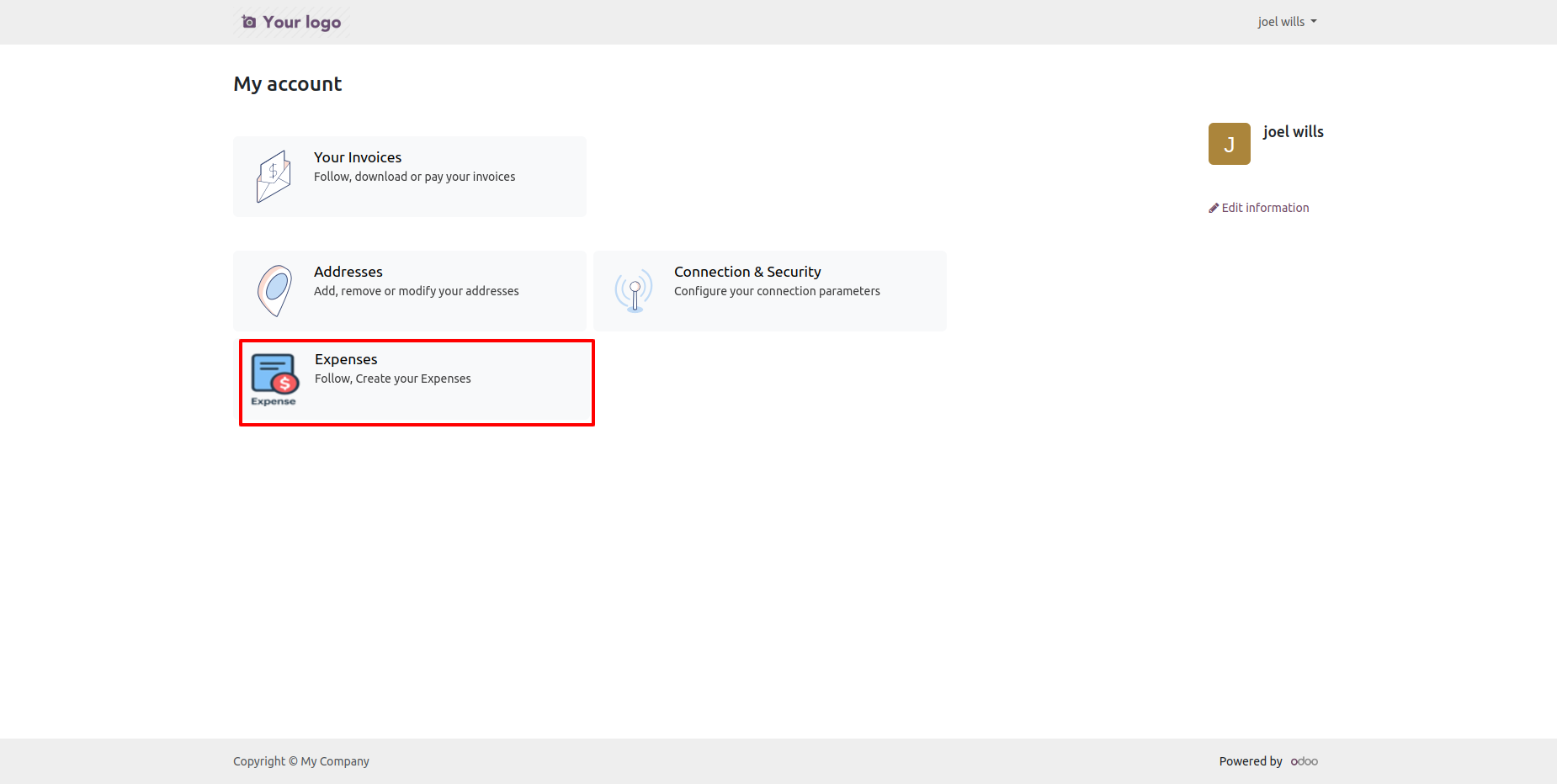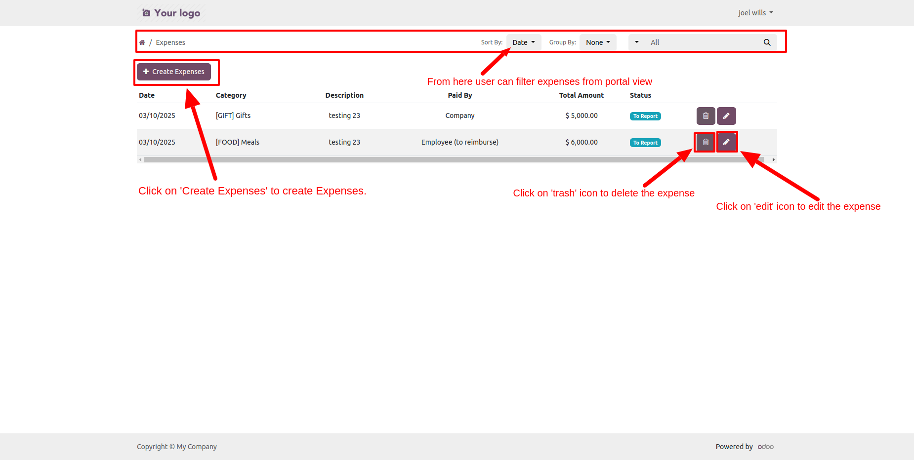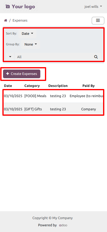 Login as a portal user to access the Expenses menu, where all Expenses associated with the employee will be displayed.