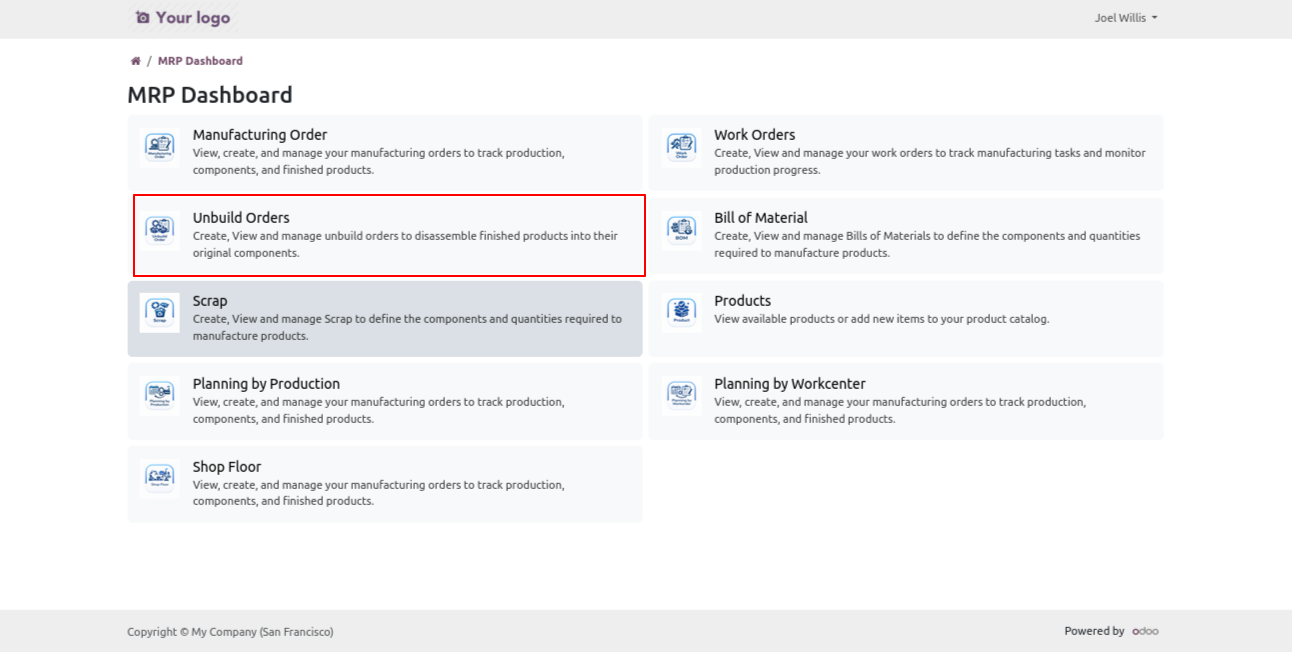 Login as a portal user to access the MRP menu, where the MRP dashboard will display menus for Manufacturing Order,Work Order,Unbuild Order,Scrap,Product,Product Variant,Planning By Production,Planning By Workorder,Product,Product Variant based on the access permissions assigned to the associated employee.