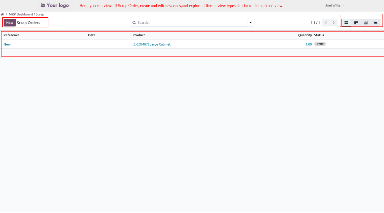 Click on the Scrap menu to open a view similar to the backend interface, where the user can create, view, and edit scrap order.