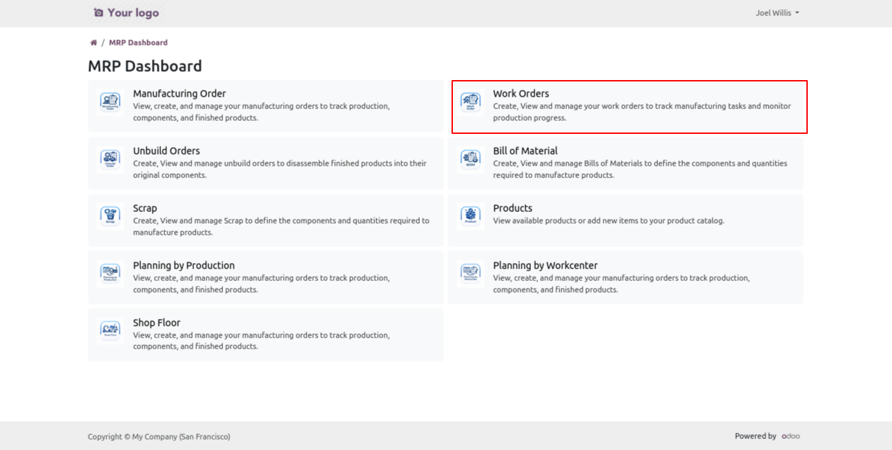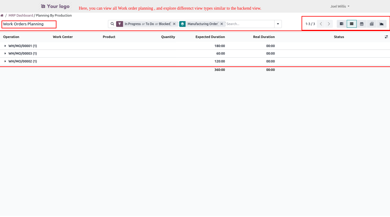 Click on the Work Order menu to open a view similar to the backend interface, where the user can see all work order and manage them through the standard MRP workflow.