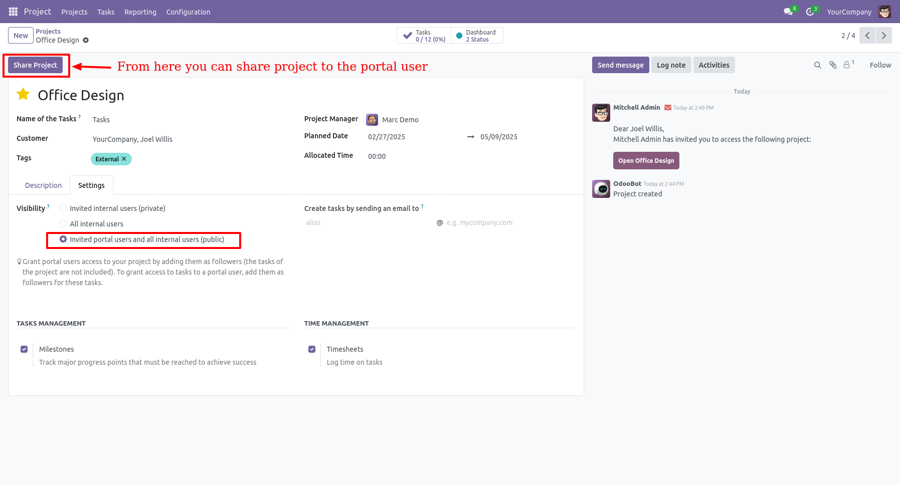 Install the module, create an employee record for the portal user, and assign them read or edit access rights to the project as needed.