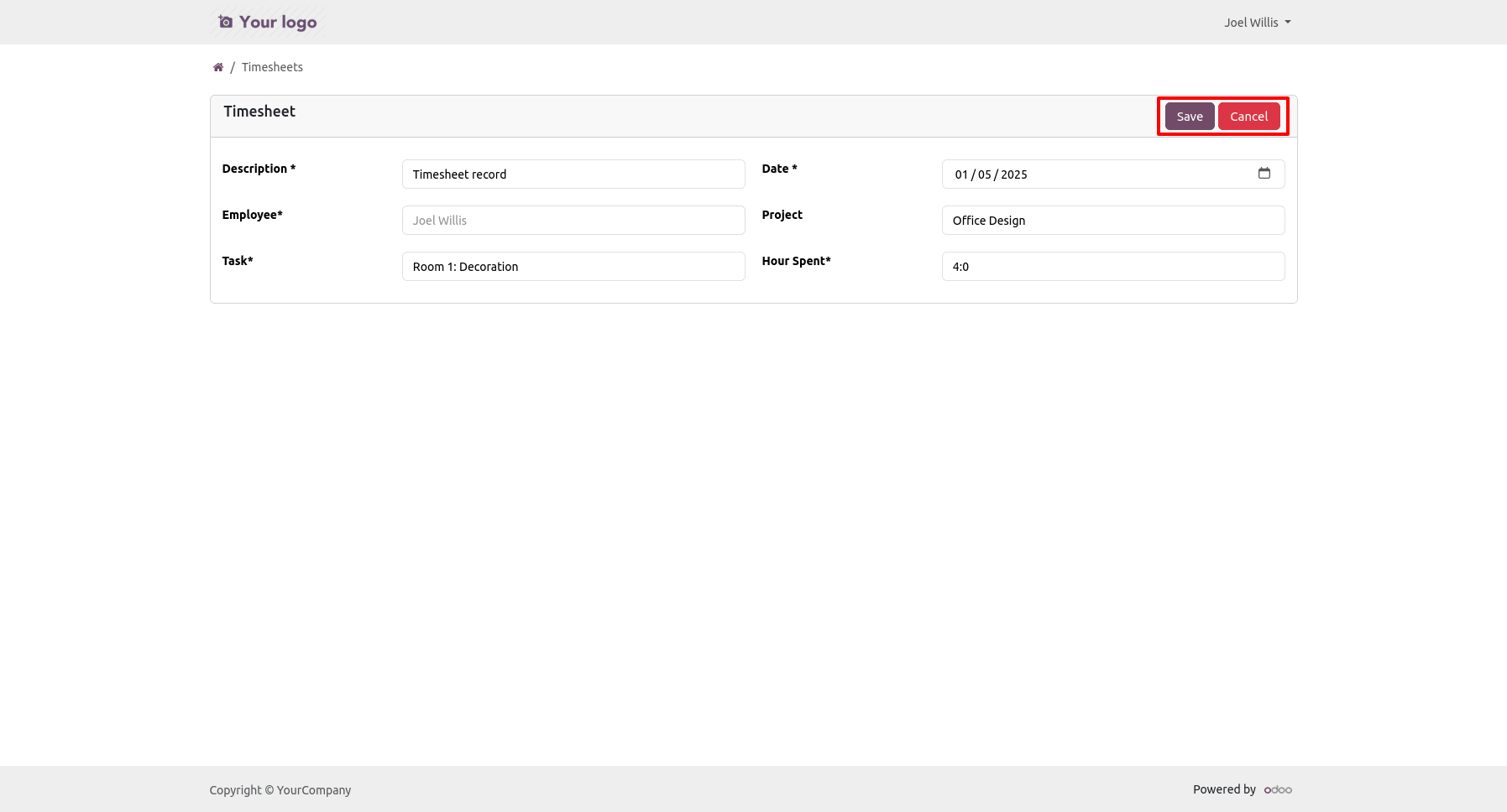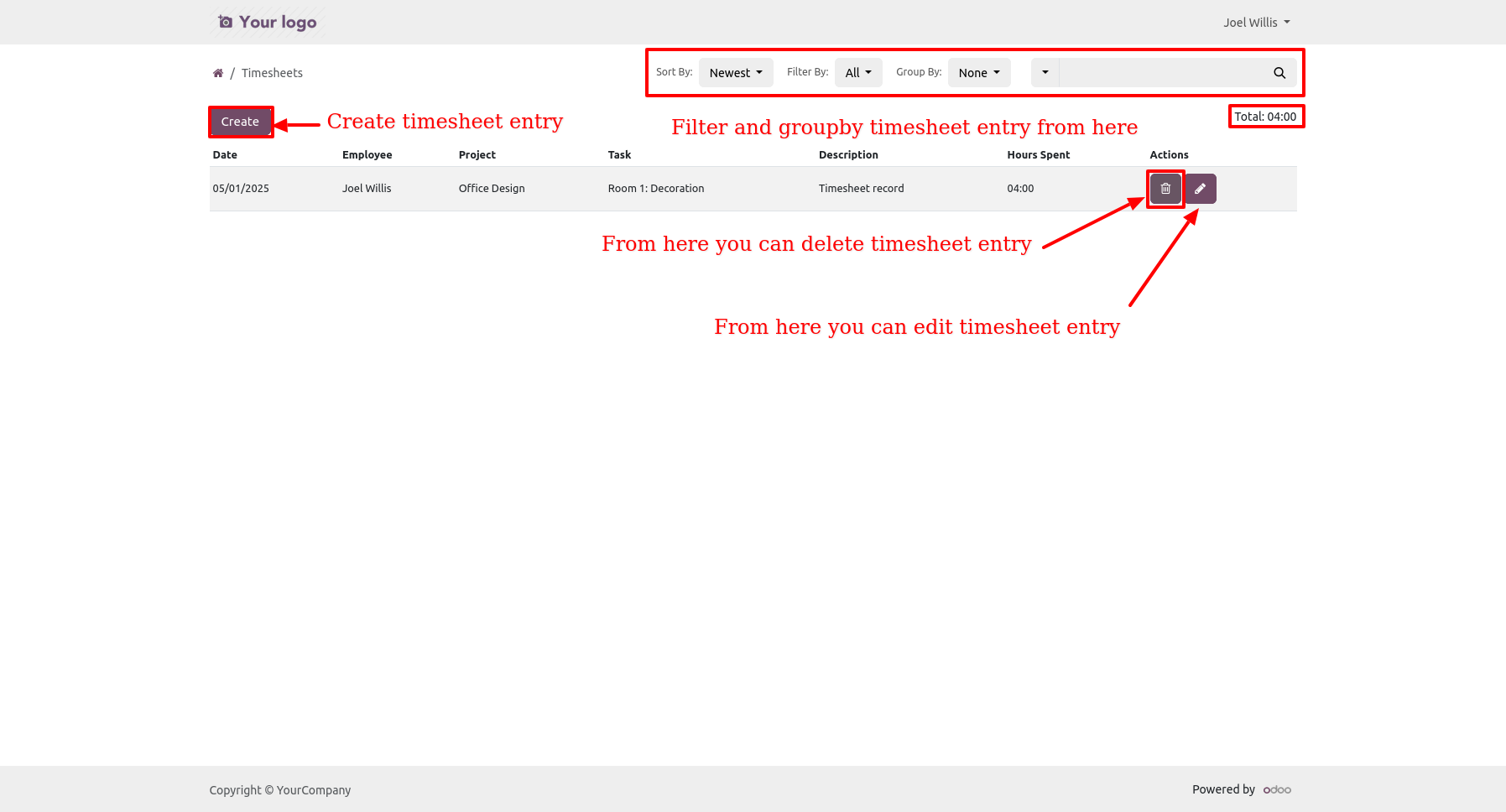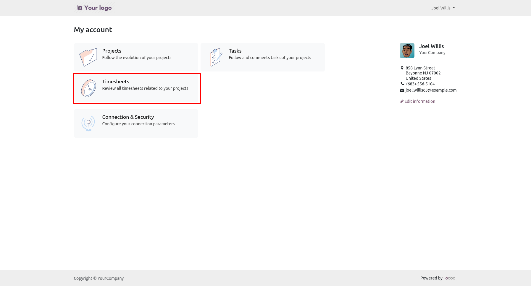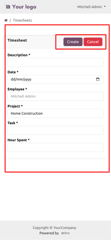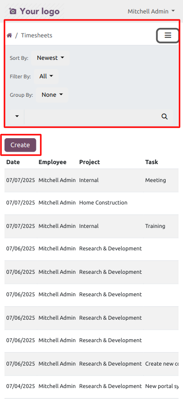Login as a portal user to access the Timesheet menu, where all timesheet entries associated with the employee will be displayed.